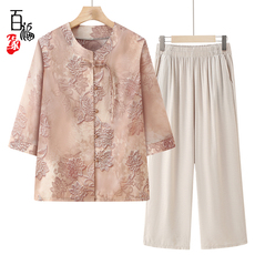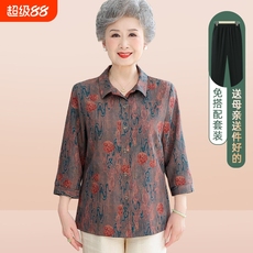 奶奶夏装七分袖衬衫中老年人女妈妈夏季冰丝开衫套装老太太上衣服