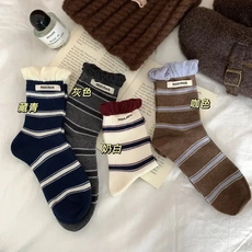 美拉德撞色条纹中筒袜子女韩版复古森系透气秋冬勃肯鞋堆堆袜学院