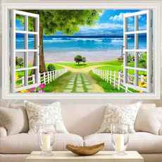 3D立体假窗户墙贴纸创意卧室客厅装饰贴画墙壁海景风景画蓝天白云
