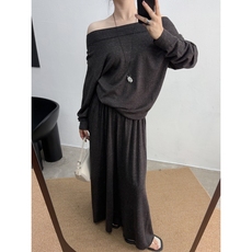 优雅斜肩一字领上衣+半身裙套装女天丝亚麻针织衫设计感宽松长袖T
