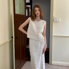 韩雨嘉【珍珠缎感】白色提花缎面吊带连衣裙天丝亚麻针织开衫套装