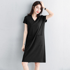 黑色宽松v领短袖连衣裙女夏中长款休闲大码胖mm遮肚显瘦打底裙子