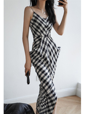 高级感黑白格子连衣裙夏小众设计感V领开叉吊带长裙休闲度假裙子