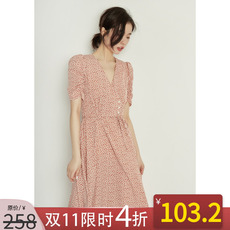 sdeer圣迪奥碎花连衣裙夏季女长裙V领收腰泡泡袖茶歇裙S223Z120E