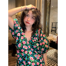 落落狷介 碎花连衣裙2025新款女设计感小众V领裙子宽松开叉长裙
