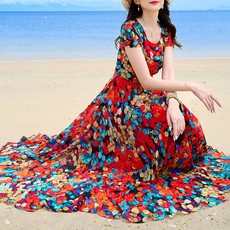 2025夏季高端时尚法式真丝桑蚕丝连衣裙圆领修身碎花沙滩大摆长裙