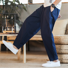 夏季亚麻松紧腰系绳休闲裤子男纯色含棉直筒裤哈伦裤长裤宽松