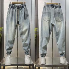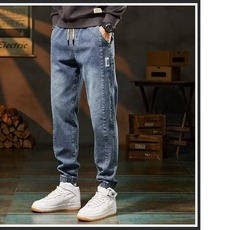 春秋款男士宽松弹力小脚长牛仔裤男潮牌松紧腰带休闲百搭哈伦裤