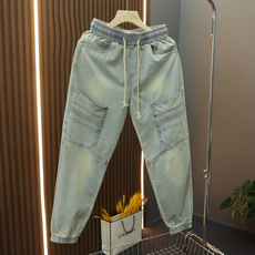 春秋季新款裤子男潮牌时尚口袋牛仔裤男士百搭宽松休闲束脚哈伦裤