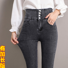 高腰排扣牛仔裤女加长版小脚铅笔裤超长175高个子修身秋冬加绒厚