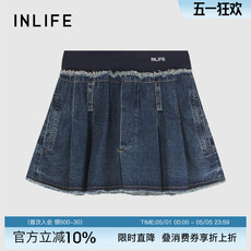 伊纳芙高腰牛仔百褶半身裙女春季新款复古蓝色磨毛A字裤裙短裙子