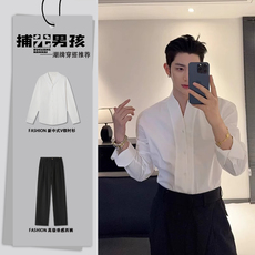 韩版修身碎花短袖衬衣冰丝西装短裤男士轻奢夏季套装痞帅冰丝衬衣