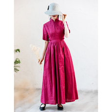 仙衣裾设计师夏苎麻连衣裙新中式复古立领仙女裙玫红色修身长裙女