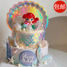 美人鱼公主蛋糕装饰鱼尾鱼鳞海草珊瑚抱贝壳小女孩生日派对插件