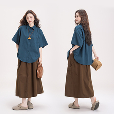 日系复古蓝色短袖衬衫女2025夏季新款咖色宽松显瘦半身裙子两件套