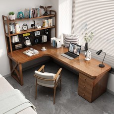 实木转角书桌书架一体桌卧室家用学生学习桌子台式电脑桌组合书柜