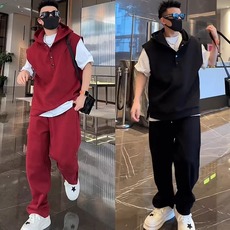 运动纯棉背心男套装夏季潮牌无袖T恤坎肩男装一整套搭配工装短裤