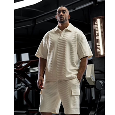 新中式华夫格休闲套装短袖t恤男夏季大码宽松搭配运动短裤两件套