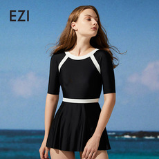 弈姿新款连体裙式泳衣女夏黑色遮肚显瘦防晒v领泡温泉海边游泳衣