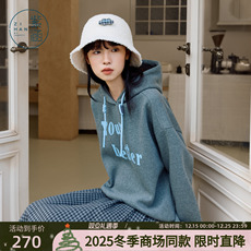 大王家连帽套头卫衣女灰色字母抽绳男友风宽松加绒上衣2025年秋冬