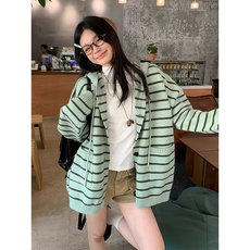 知意大码2025春减龄元气抽绳连帽条纹针织开衫女宽松显瘦毛衣外套