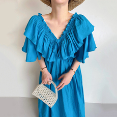 韩国chic夏季复古V领抽绳系带木耳荷叶边褶皱收腰飞飞袖连衣裙女