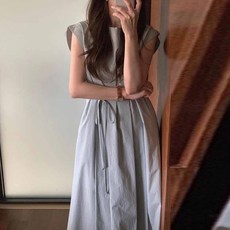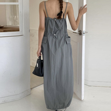 韩国chic夏季高级感简约圆领系带收腰显瘦压褶无袖连衣裙长裙女