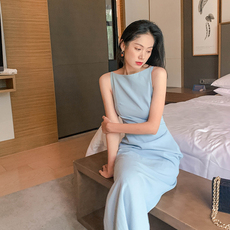 韩国chic夏季法式温柔挂脖圆领露肩设计系带收腰无袖背心连衣裙女