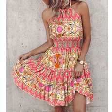 波西米亚欧美夏季露背Sexy挂脖收腰碎花无袖荷叶边连衣裙女DRESS