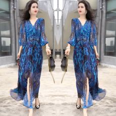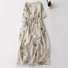 夏新款苎麻印花连衣裙度假旅游收腰显瘦过膝长裙仙抽绳腰带中长款