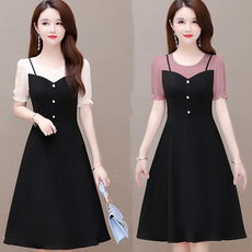 法式假两件短袖连衣裙女夏新款设计感韩版收腰a字裙显瘦中长裙子