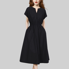 莫代尔V领连衣裙黑色大码过膝长裙收腰显瘦气质后开叉T恤裙春夏女