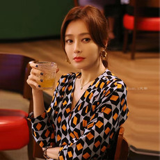 芳心荡漾秦岚明星同款D家橘色印花连衣裙夏收腰系带一片式裹身裙