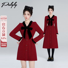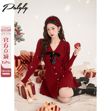 新年红色v领收腰连衣裙女冬季小香风圣诞穿搭法式蝴蝶结打底a字裙