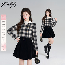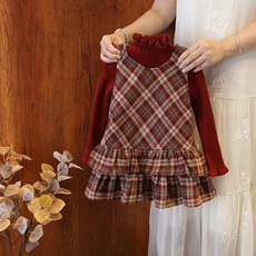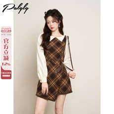 法式娃娃领假两件绝美连衣裙女冬季小香风千金格子蓝色打底a字裙