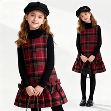 女童连衣裙秋冬季2025年新款黑色半高领打底拜年服格子裙子两件套