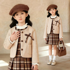 女童韩版套装2025秋冬季新款打底衫蝴蝶结外套格子连衣裙三件套潮
