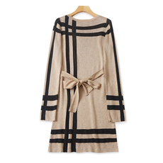 外贸条纹长袖针织连衣裙 春秋新款女时尚中长款系带毛衣裙子21343