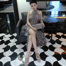 春夏新款气质国风辣妹旗袍式开叉超短丝绒无袖修身连衣裙时尚旗袍