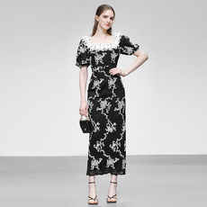 2025年夏季新款时尚气质花边方领灯笼袖收腰显瘦直筒蕾丝连衣裙
