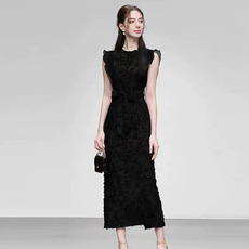 2025夏季新款圆领荷叶飞肩雪纺流苏系蝴蝶结腰带收腰直筒连衣裙