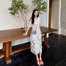 heidy海蒂 金山日落 抽皱水墨蕾丝边连衣裙2025夏季V领直筒长裙子