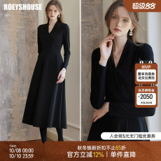 罗衣气质黑色针织连衣裙女2025秋冬新款时尚V领大摆打底裙子09660