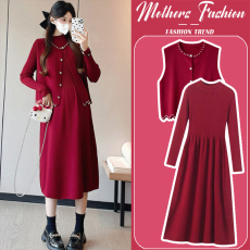 孕妇连衣裙套装秋冬2025新款韩版洋气红色马甲打底裙针织两件套女