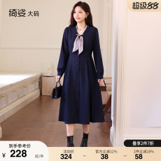 绮娑秋冬装新款V领丝巾收腰A字显瘦胖MM大码百搭长袖连衣裙打底裙
