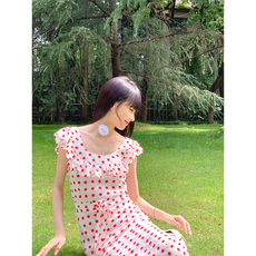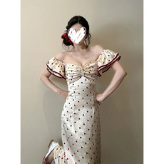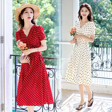 法式复古连衣裙女2024夏季新款系带收腰红色波点雪纺裙长款过膝