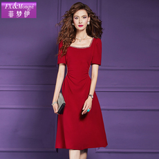 菲梦伊钉珠红色连衣裙女短袖夏季法式名媛赫本风褶皱收腰方领裙子