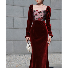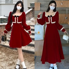 现货速发大码法式红色方领丝绒连衣裙装2024春季高级感收腰a字裙