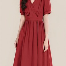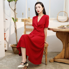 法式气质V领连衣裙2024年夏季新款红色收腰中长款时尚裙子女1305