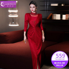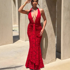 蕾丝花边v领吊带连衣裙女秋冬生日宴会红色裙子气质收腰鱼尾长裙